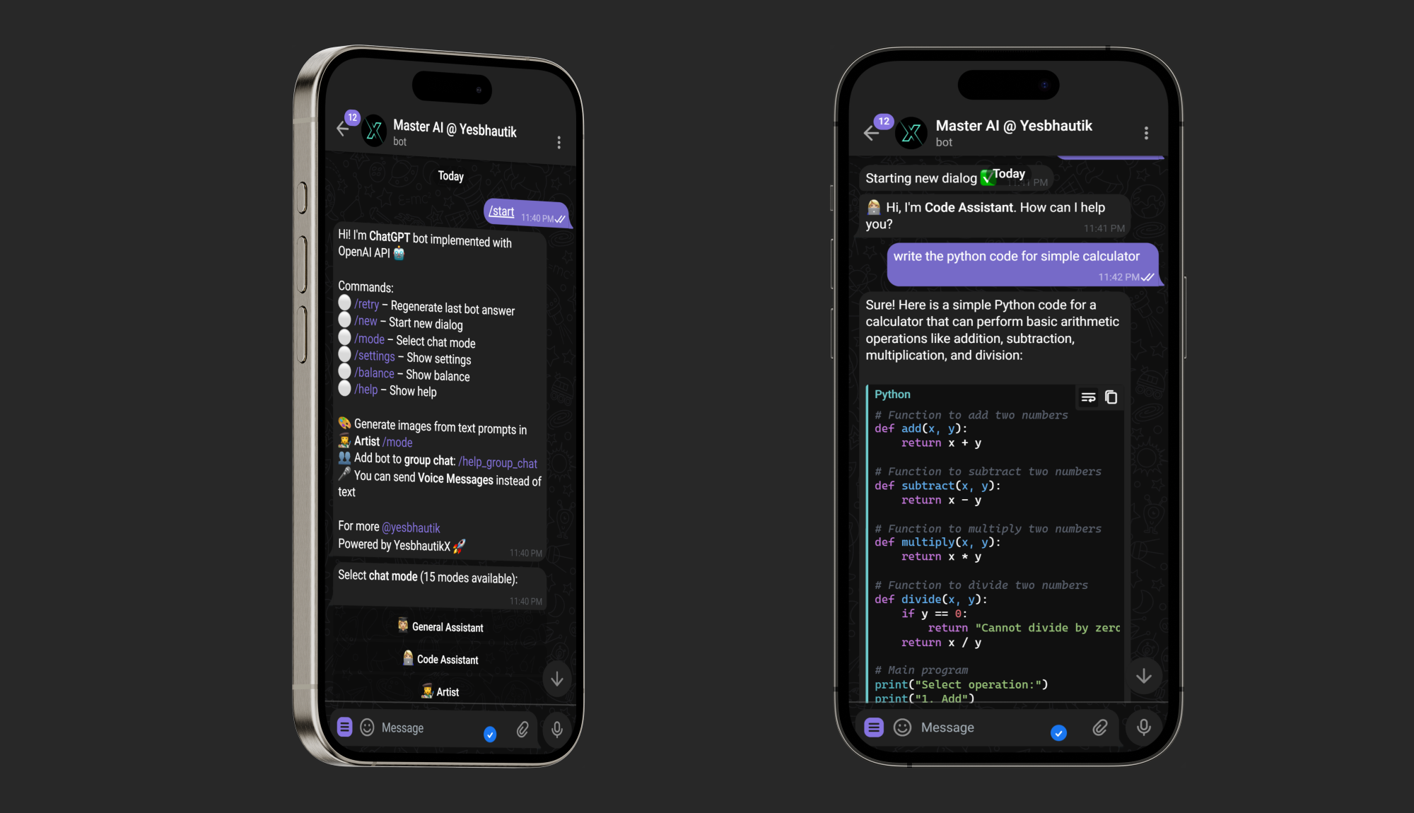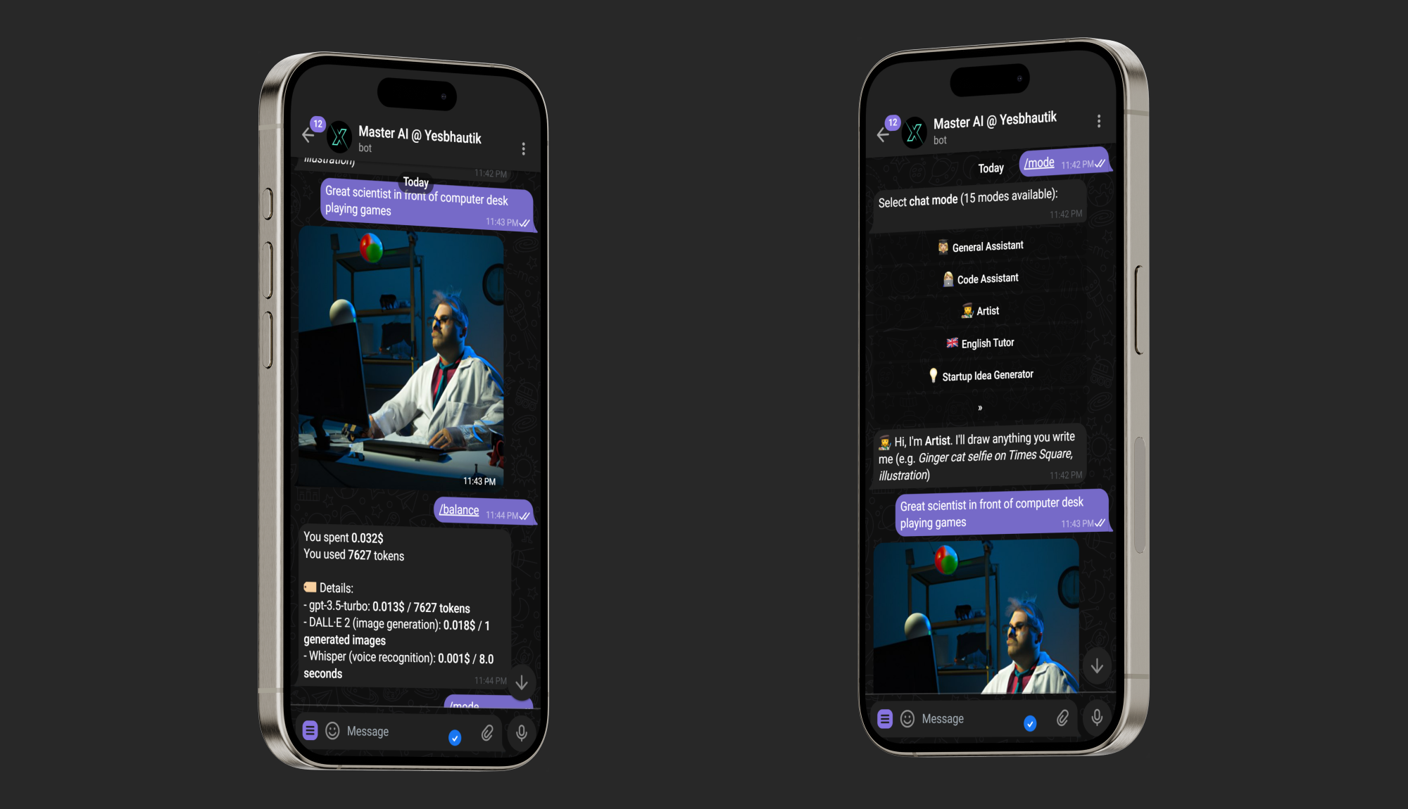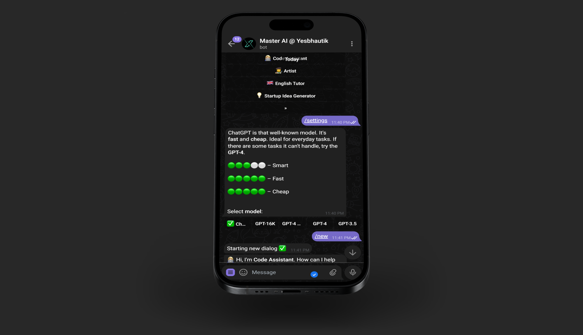 Dive into group chats, unleash creativity with DALLE 2 integration, and enjoy the convenience of voice message recognition. Coders, rejoice with our code highlighting feature. With 15 unique chat modes, including an Assistant, Code Assistant, Artist, Psychologist, and even an Elon Musk mode,, Master AI Bot keeps every conversation fresh and engaging.