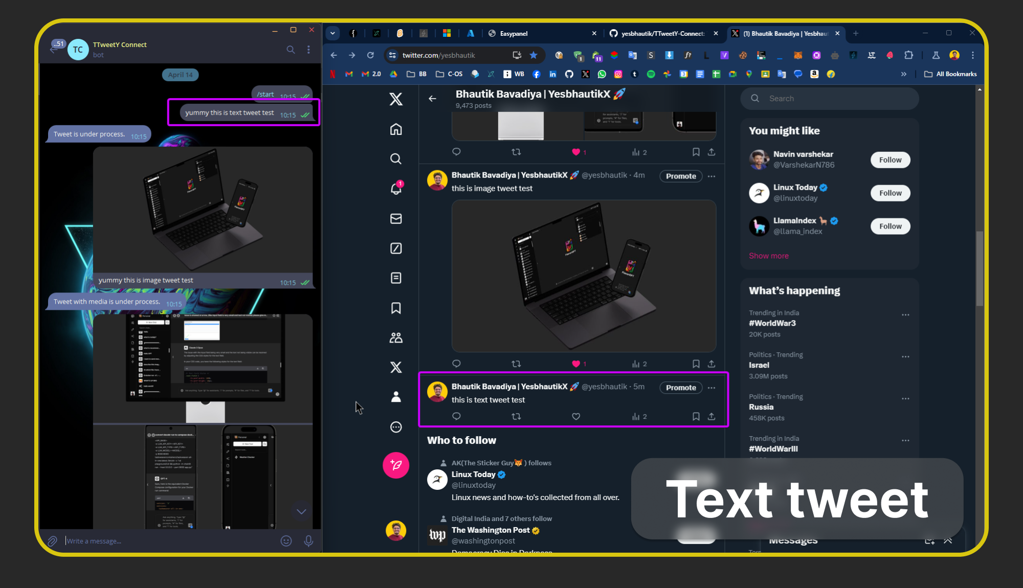 With TTweetY Connect, you can automate the process of creating and managing posts on Telegram, and even directly post content on Twitter, provided it meets Twitter's posting guidelines.